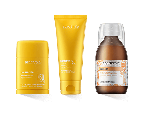 Vor und nach dem Sonnenbaden pflegen und schützen die Académie Bronzécran Crème Réparatrice Visage und die reichhaltige Lait Réparateur Corps Gesicht und Körper und reparieren Hautschäden. Die Bronzécran Mat Tinted Day Cream mit SPF 65 erhält die natürlich leuchtende Bräune der Haut und kreiert einen schützenden, egalisierten Teint. Auch die Cuivré Tinted Day Cream mit SPF 6 ist eine delikate, bräunungsverlängernde Tagespflege. Sie eignet sich besonders für dunkle Hauttypen.