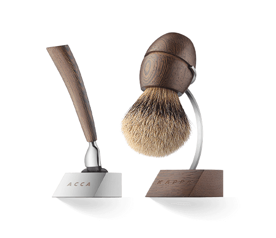 Die Acca Kappa Men's Grooming Utensilien für die Rasur, vom Pinsel bis zum Rasiergriff setzt die Marke auf hochwertiges Resin, wertige Kunststoffe oder Aluminium. So liegen die Rasierpinsel und Rasierer, die auf die bekannten Gilette Mach 3-Klingen abgestimmt sind, perfekt in der Hand.