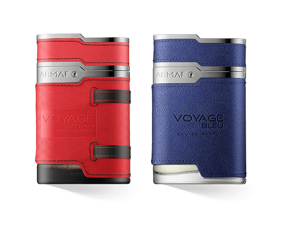 Die Duftserie Armaf Voyage wird in ähnlichen Flakons angeboten. Die Grundform ist gleich, die Farbgestaltung ist unterschiedlich. Die Form erinnert an ein Säckchen. Ein hochkant stehender Quader mit stark abgerundeten Seitenkanten erhält durch eine stufenförmige Abtrennung am oberen Ende einen dynamischen Charakter. Kappe und Flasche gehen fliessend ineinander über. Im oberen Bereich ist der Markenname eingeprägt und mit einem kleinen Glitzerstein verziert. Der Flakon ist jeweils mit einem Ledermantel überzogen, der je nach Duft in einer passenden Farbe gewählt wird. Neben den namensgebenden Farben strahlen Hawaii in einem kräftigen Pink sowie Blau und Titan in einem kräftigen Rot mit schwarzen Elementen. Die Elemente der Flakons verbinden die Reise in Form einer Tasche mit den durch die Farben unterstrichenen Gefühlen, so dass das Design auch ein Hinweis auf den jeweiligen Duftcharakter des Parfums ist.