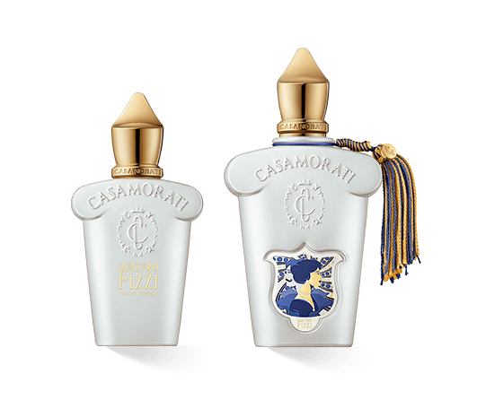 Der Flakon von Quattro Pizzi präsentiert sich im eleganten Art-Déco-Stil, der typisch für die Casamorati-Kollektion ist. Mit seinem weissen Design und den goldenen Akzenten symbolisiert er die Reinheit und den Luxus des Duftes. Die buchähnliche Verpackung mit kunstvollem Cover unterstreicht die Exklusivität und den historischen Bezug des Parfums.