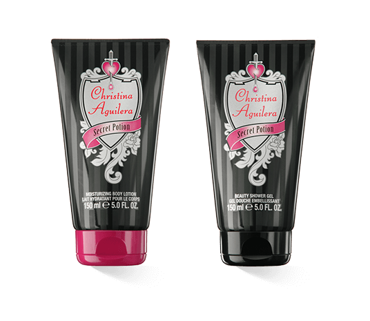 Auf dem gläsernen Flakon ist das für Christina Aguilera charakteristische Wappen in weisser Farbgebung eingearbeitet, welches sich harmonisch mit der femininen, selbstbewussten Farbe des Flakons verbindet. Die schwarze Kartonverpackung, auf welcher sich dezente Streifen absetzten, bezaubert auf magisch, geheimnisvolle Weise und reflektiert die sinnliche Atmosphäre der Nacht. Ebenfalls in Weiss zeigt sich wiederholt das Wappen auf welchem in Pink der Schriftzug "Christina Aguilera" und darunter auf pinkfarbenem Banner der Name "Secret Potion" erscheint. Somit verbindet sich das selbstbewusste Design des Flakons mit der geheimnisvollen Aufmachung der Verpackung des exotischen, sinnlichen und orientalisch-blumigen Damendufts Christina Aguilera Secret Potion.