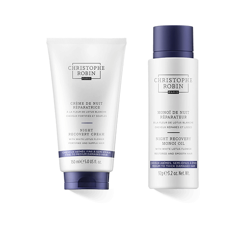 Christophe Robin Night Recovery besteht aus einem Öl und einer Creme für die Haarlängen und -spitzen. Die Linie nutzt die beruhigende und schützende Wirkung des weissen Lotus, der seit langem in der Hautpflege verwendet wird. Das Night Recovery Monoi Oil basiert auf traditioneller polynesischer Kosmetik. Es besteht aus Kokosnussöl und den weissen Blüten der Tiaré-Pflanze, die vor Sonnenaufgang geerntet werden. Denn nur dann geben die Blüten ihre pflegenden und feuchtigkeitsspendenden Inhaltsstoffe sowie ihren Duft an das Kokosöl ab.