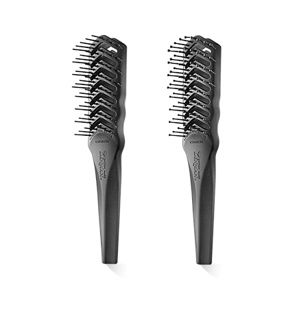 Ganz anders stellen sich die Denman Freeflow D100 Untipped und die D100 The Tunnel Vent vor. Ihre Körper sind aus einem Stück, hochwertigen, leichten und hitzebeständigen Kunststoffs gefertigt. Sie haben kein Kissen, aber Spalten, die die Wärme beim Föhnen durch den Bürstenkörper in die Haare leiten. Die Haare werden schneller trocken und schonender gestylt, da sie der Hitze weniger lange ausgesetzt sein müssen. Auf den ersten Blick unterscheiden sich die beiden D100 Bürsten mit ihren ergonomischen Griffen nicht voneinander. Sieht man genauer hin, erkennt man, dass die Borsten der D100 The Tunnel Vent kleine Köpfe haben. Bei der D100 Untipped sind die Borsten nur abgerundet, womit ein besonderer Wunsch der Profikunden erfüllt wird. Lange und lockige Haare waren der Grund für die Entwicklung der ersten Denman Bürste.