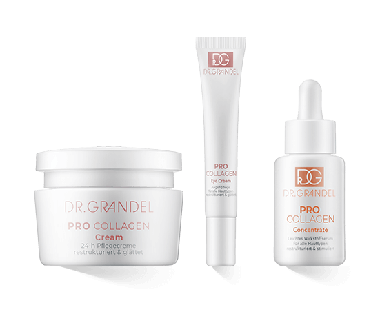 Hierzu gehören die Dr. Grandel Pro Collagen Eye Cream, die speziell für den empfindlichen und besonders von Fältchen betroffenen Bereich um die Augen entwickelt wurde. Die Dr. Grandel Pro Collagen Cream Rich glättet besonders trockene Haut mit einer noch reicheren Pflegeformel. Die Dr. Grandel Pro Collagen Creme wurde für alle Hauttypen konzipiert. Das Serum Dr. Grandel Pro Concentrate ist ein Kick für die Haut: Wenige Tropfen in der Pflegeroutine führen zu sofort sichtbaren Ergebnissen. Die Haut wird stimuliert und wieder aufgebaut.<