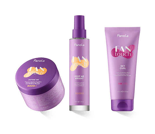 Fanola FANtouch bietet die ganze Bandbreite des Stylingvergnügens, von der Lockenpracht über den klassischen Sleek-Look bis hin zur frechen Kurzhaarfrisur. Auch für Orientierung ist gesorgt: Das FANtouch-Motiv in fünf fröhlichen Farben kennzeichnet die Styling-Kategorie. Lila steht für Fixieren, Blau für mehr Volumen, Grün für Haarschutz, Rot für Styling und Gelb für mehr Glanz. Von 0 bis 5 ist jeder Haltefaktor dabei. So kann sich jede Frau ihre individuelle Fanola FANtouch Kollektion zusammenstellen.