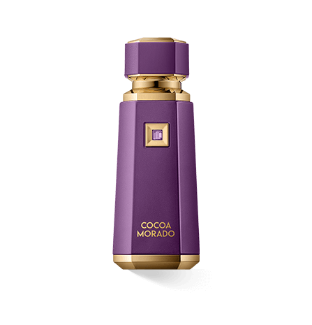 Der Flakon von Cocoa Morado unterstreicht diese luxuriöse Ausrichtung eindrucksvoll. Das schwere, facettierte Glas in einem tiefen, intensiven Morado-Purple erinnert zugleich an reiche Kakaotöne und edle Edelsteine. Klare, geometrische Details verleihen dem Design eine moderne, architektonische Strenge, während goldene Akzente und eine mattschwarze Kappe für Prestige und Eleganz sorgen. Auch die Premium-Verpackung in dunklem Violett mit Goldveredelung greift das orientalische Thema auf und spiegelt den raffinierten, opulenten Charakter des Duftes wider.