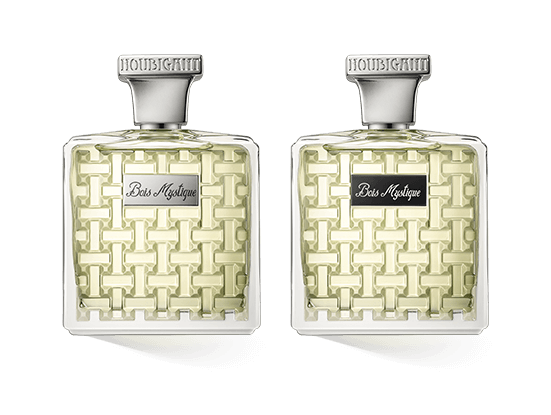 Der Noblesse und Tradition des Parfumhauses Houbigant entsprechend, ist der Flakon von Bois Mystique elegant und schön. Die viereckige Form vermittelt Wertigkeit. Das schön geschliffene Glas erinnert mit seinem Muster an einen geflochtenen Korb, was wiederum auf die Ursprünge des Parfumhauses anspielt, als Jean-Francois Houbigant ein gemaltes Schild mit einem Korb voller Blumen über den Eingang seines Parfumladens hing. Houbigant Bois Mystique nutzt Blumen nur, um dem Duft etwas Süsse im sonst sehr maskulinen, holzig-würzigen Charakter zu geben. Voller Stärke und Kraft schliesst die silberfarbene Kappe den transparenten Flakon ab.