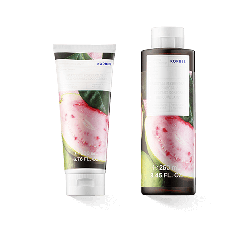 Das Shower Gel von Korres entfaltet einen pflegenden Schaum, der die Haut verwöhnt. Rote Traube, Quittenextrakt und Guave leiten die Regeneration der Haut ein und reinigen sie gründlich. Mit einem sanften Peeling werden Ablagerungen und Verschmutzungen nicht nur von der Oberfläche, sondern auch aus den Poren entfernt. Nach dem Baden oder Duschen lässt sich die Wirkung des Duschgels mit der Guava Körperbutter verlängern und intensivieren. Sie legt einen feinen Film auf die Haut, der weder fettend noch beschwerend wirkt. Die Körperbutter fördert mit Aloe vera die Produktion von Elastin und Kollagen. Dies sorgt für eine festere und gleichmässigere Hautstruktur.