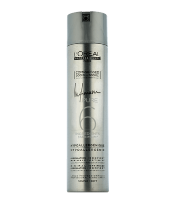 Das Infinium Pure Soft Compressed Haarspray von L'Oréal Professionnel verleiht Ihrem Styling ein natürliches, lockeres Finish mit flexibler Fixierung. Dank der ultrafeinen Sprühdiffusion legt es sich federleicht auf das Haar, ohne es zu beschweren, und sorgt für Volumen und Beweglichkeit. Die hypoallergene Formel ohne Parfüm- und Duftstoffe enthält nur sechs Inhaltsstoffe und bietet optimalen Anwendungskomfort. Dank der innovativen Compressed Technology ist das Haarspray bis zu 60 Prozent ergiebiger als die frühere 500-ml-Version und somit ideal für professionelle Stylings und Hochsteckfrisuren.