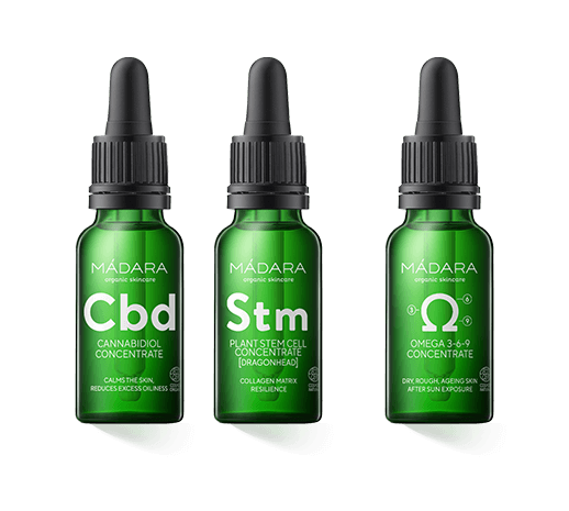 Die MÁDARA Custom Actives können einzeln aufgetragen und kombiniert werden.