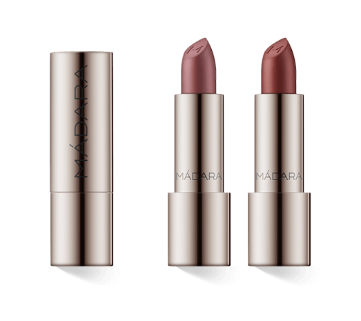 Der MÁDARA Dazzle Night Lipstick ist in vier verführerischen Farbvarianten erhältlich: in der soften Rose-Nuance Flattery, im kühlen Mauve-Ton Charisma, im warmen Rust und im rotbraunen Dominance. Seine natürlichen Mineralpigmente verleihen den Lippen den kräftigen Glow und die schimmernde Textur der 80er - und sind dank des Satin-Finishes dennoch so dezent, dass ihn selbst Schmink-Anfängerinnen mühelos anwenden können.