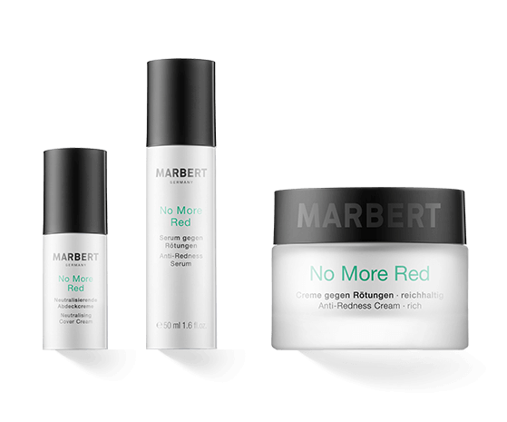 Mit der Serie Marbert No More Red wurde eine effektive Hilfe gegen Rötungen entwickelt. Die innovative und hochwertige Rezeptur mit natürlichen Wirkstoffen wirkt gezielt gegen Irritationen und sichtbare Kapillaren, die zu roten Flecken und damit zu einem unregelmässigen Teint führen. Zusätzlich bieten sie durch Pflege und Stärkung einen vorbeugenden Effekt gegen erneute Reizungen.