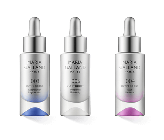 Maria Galland Ultim'Boost umfasst derzeit sechs Booster mit unterschiedlicher, aber gleich intensiver Pflegewirkung. So versorgt 001 Hydration die Haut intensiv mit Feuchtigkeit, Nährstoffen, Mineralien und Spurenelementen. Dadurch festigt sich die Zellstruktur, und der Teint erstrahlt feinporig und glatter. Die gut mit Feuchtigkeit versorgte Haut ist optimal auf weitere Pflegeprodukte vorbereitet. Innerer Stress und äussere Umwelteinflüsse belasten sie weniger. 002 Pureté hat einen Peeling-Effekt. Der Booster hellt den Teint auf und verleiht eine schönere Glätte. Das Pflegeergebnis bei längerfristiger, zweimal täglicher Anwendung sind verfeinerte Poren und ein ebenmässiger Teint. Vorteilhaft an allen Tinkturen ist deren gute Verträglichkeit. Gerade gestresste und müde Haut ist auf diese sanften Wirkstoffe angewiesen. Die folgenden zwei Produkte von Maria Galland Ultim'Boost wurden speziell zur Vitalisierung müder Haut und als Antifalten-Pflege entwickelt. So stimuliert 003 Régénération die Regeneration der Haut, stärkt sie und schützt vor freien Radikalen. Haut, die sich selbst gut regeneriert, ist den Belastungen im Alltag viel besser gewachsen, sei dies durch körperlichen Stress, den natürlichen Alterungsprozess oder Umwelteinflüsse. Ist die Haut bereits von den genannten Belastungen geschwächt, erhält sie mit 004 Éclat wieder neue Kraft. Der spezielle Booster verbessert die Ausstrahlung faltiger und müder Haut. Er sorgt für ein straffes, festeres Hautbild. Besonders nachhaltig ist der stärkende Effekt, wenn das Produkt über einige Wochen regelmässig nach der Reinigung aufgetragen wird. Maria Galland Ultim'Boost kümmert sich auch um reife Haut, die trotz Stimulation nicht mehr aus eigener Kraft vollständig regenerieren kann. Beispielsweise strafft 005 Tenseur die Haut und festigt die Zellstruktur. Der Booster reduziert Falten und feine Linien, wodurch der Teint wieder strahlend vital erscheint. Die mikrofeine Textur wird von der Haut bis in die tieferen Hautschichten schnell und gut aufgenommen. 006 Uniformité lässt den Teint ebenmässiger und gestrafft erscheinen. Es reduziert Pigmentflecke und beugt deren Neubildung vor. Ein angenehmer Effekt aller Produkte dieser Booster-Serie ist die Feuchtigkeitsversorgung bei jeder Anwendung. Denn gerade müde und schlaffe Haut neigt zur Trockenheit. Dies würde sie noch angreifbarer machen. Doch nun ist sie widerstandsfähig, was auch am frischen Hautbild zu erkennen ist.