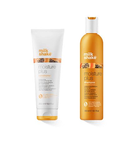 Die duftende Spezialpflegeserie für trockenes Haar besteht aus einem glättenden Shampoo, einem pflegenden Conditioner, einem intensiv pflegenden No-Rinse Haarschaum und einer leichten Feuchtigkeitslotion für das Haar. Während das Milk_Shake Moisture Plus Shampoo das Haar sanft reinigt, pflegt und entwirrt, verleiht der Moisture Plus Conditioner mit Bio-Papayaextrakt dem Haar Feuchtigkeit und Volumen. Die reichhaltige Moisture Plus Whipped Cream macht das Haar nach dem Waschen weich, glänzend, vital und leicht frisierbar. Zur Pflege und Auffrischung dient die Moisture Plus Hydrating Lotion. In die Längen eingearbeitet, verleiht sie dem Haar Glanz und Vitalität und schützt die Farbe.