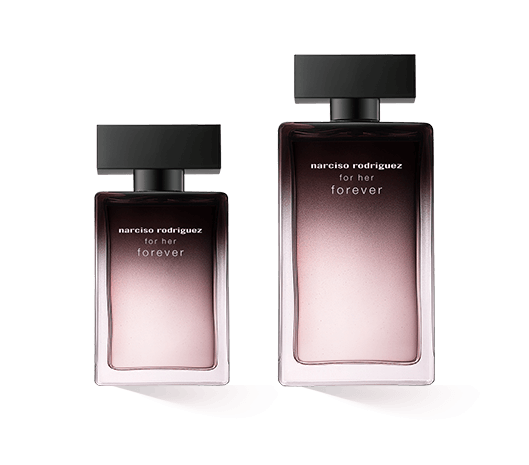 In der Duftreihe Narciso Rodriguez for her reiht sich Forever mit seinem charakteristisch schlanken, hohen Flakon, der von einer blockartigen, breiten Verschlusskappe gekrönt ist, ein. Der sinnlich-geheimnisvolle und dennoch fröhliche Duft wird durch einen Farbverlauf von transparent, über ein dunkles Rosé bis hin zu Schwarz dargestellt. Der Name des Duftes steht in klarer, roséfarbener Schrift im oberen Bereich des Flakons. In diesem Design findet sich das modische Verständnis des US-Amerikaners wieder, das von klaren Schnitten, unkonventionellen Details und starken Kontrasten geprägt ist.