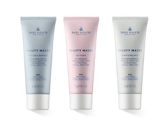 Die Sans Soucis Schönheitsmasken sind mit exklusivem Thermalwasser aus Baden-Baden angereichert. Es enthält Mineralien und Spurenelemente, die der Haut besonders gut tun: Kalzium, Chlorid, Eisen, Fluorid, Kalium, Kieselsäure, Mangan und Natrium. Sans Soucis legt grossen Wert auf die Natürlichkeit seiner Rezepturen. Deshalb sind alle Sans Soucis Schönheitsmasken vegan und frei von Mikroplastik, Mineralöl, Silikonen und Parabenen.