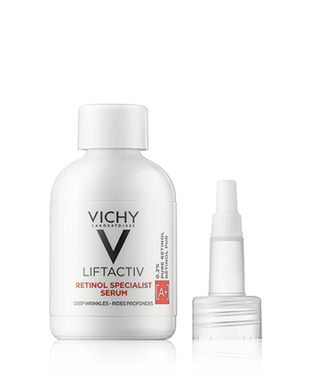 Das Retinol Specialist Serum aus der Vichy Liftactiv Reihe mildert effektiv selbst tiefe Falten und Linien. Eine hochwirksame Anti-Aging-Rezeptur pflegt das Gesicht über Nacht, fördert die Zellerneuerung und steigert die Dichte dünner werdender Haut. Schon nach wenigen Wochen präsentiert sich der Teint glatter und strahlender. Dafür sorgen neben purem Retinol auch Hyaluronsäure und probiotische Extrakte.