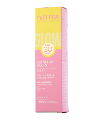 Das Weleda Spezialpflege Glowy UV-Fluid LSF 30 vereint täglichen Sonnenschutz mit natürlicher Ausstrahlung. Die leichte Formel mit einhundertprozentig mineralischen Filtern bietet sofortigen UV-A-/UV-B-Schutz und ist ideal für empfindliche Haut geeignet. Dank der Zugabe von pflegendem Moringaöl und lichtreflektierenden Glow-Pigmenten spendet das Sun Fluid 24 Stunden lang Feuchtigkeit und sorgt für einen frischen, ebenmässigen Teint, ganz ohne weissen Film. Es ist frei von Octocrylen, Octinoxat, Oxybenzon und Duftstoffen und sorgt so für geschützte, strahlende Haut.