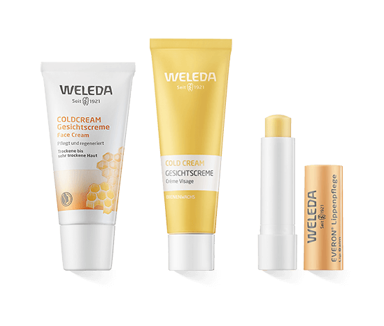 Auch die grossen Flächen der Gesichtshaut - die Stirn, die Wangen, die Nase und das Kinn - werden im Laufe der wechselnden Jahreszeiten stark beansprucht. Da bietet sich die heilende, schützende und pflegende Anwendung der Coldcream der Weleda Spezialpflege an. Die lipophile Coldcream zieht schnell durch die hydrophoben Hautschichten in die Haut ein, hinterlässt jedoch einen leichten Fettfilm auf der Haut. Sie verhindert die Feuchtigkeitsverdunstung und damit das Austrocknen. Das Produkt regeneriert trockene und sehr trockene Haut schnell, hilft bei geröteten und gespannten Hautstellen. Die Coldcream funktioniert trotz ihres Namens nicht als Kälteschutz, aber sie hält die Gesichtshaut weich und geschmeidig.