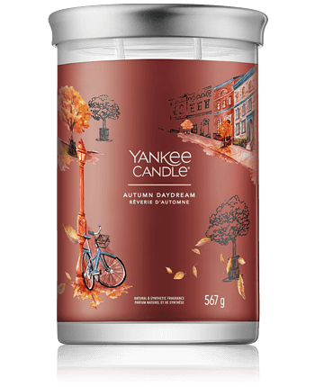 Autumn Daydream der Yankee Candle Signature Kollektion entfaltet die Atmosphäre eines Herbstspaziergangs: Mit einer Kopfnote aus Gewürznelken, Kaki und Muskatellersalbei beginnt er, erinnert mit Geranien, Lavendel und Rhabarber als Herznote an letzte Sommertage und schwingt mit einer Basisnote von Balsam und Eukalyptusholz lang anhaltend aus. Erlesene Substanzen verleihen der Duftkerze ihre Qualität.